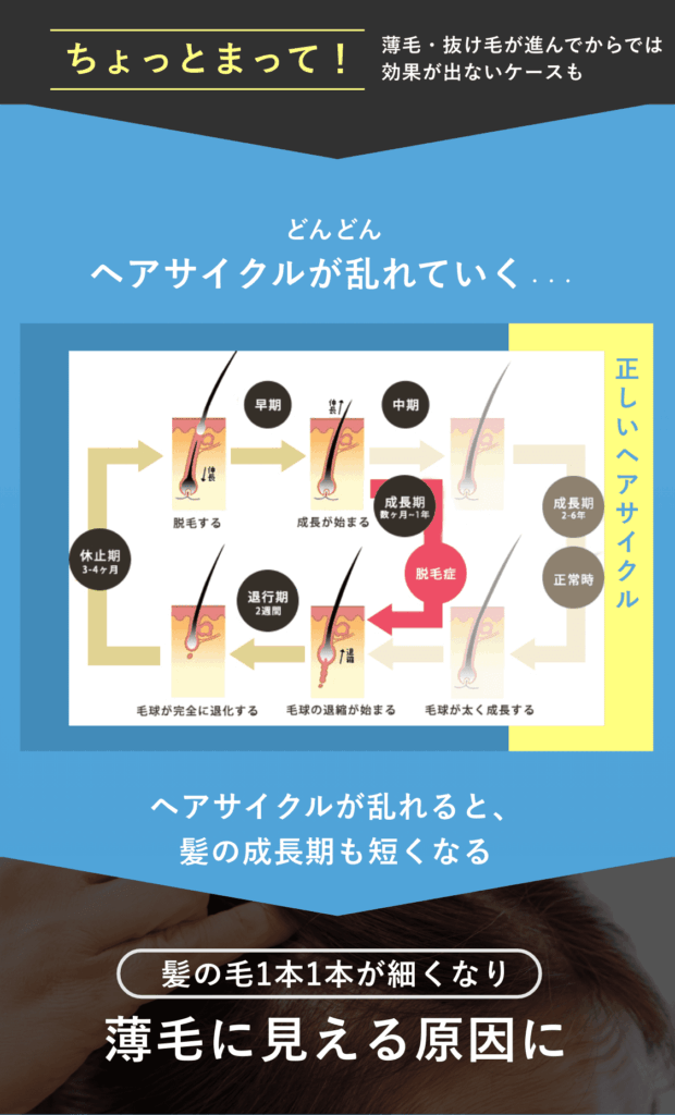 40代になると、トップのボリュームや分け目の変化は自然に進んでいきます。公式サイトでも、早めにケアを取り入れることが大切と説明されています。「まだ大丈夫」と思って放置すると、半年後には違いを感じるかもしれません。