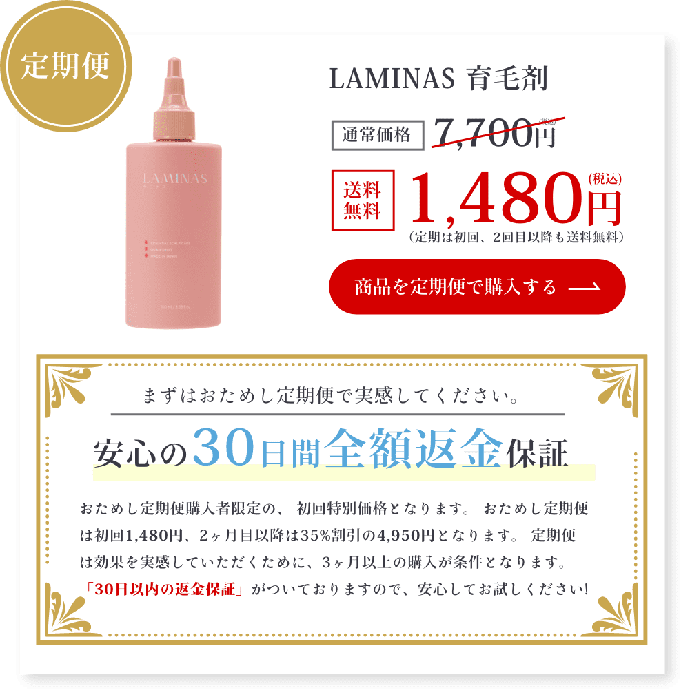 公式サイトによると、ラミナスは敏感肌でも使いやすいよう刺激を抑えた設計になっています。市販の育毛剤は、どうしても強めの成分が入っているものもあるので、毎日使うには不安が残ることがありますよね。ラミナスは毎日続けられる安心感が、40代女性には特に嬉しいポイントです。